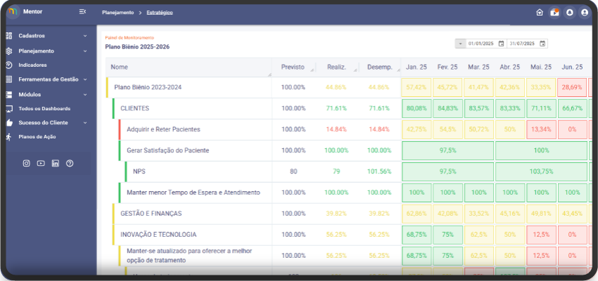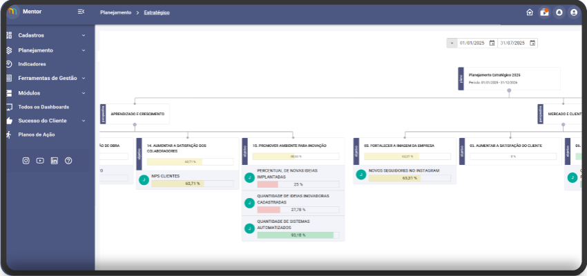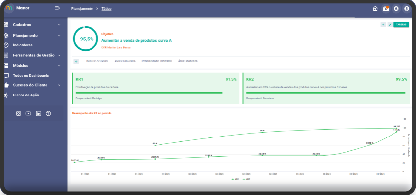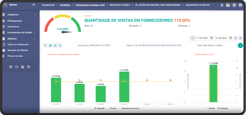 Simplifique a gestão e ganhe visão 360º da sua operação. Gestores não precisam de mais planilhas, e sim de clareza. O MentorWeb conecta metas, indicadores e planos de ação em um ambiente único, rastreável e atualizado em tempo real. Acompanhe o que está funcionando, antecipe desvios e tome decisões com base em dados confiáveis. Menos ruído, mais controle. Mais estratégia, menos achismo.