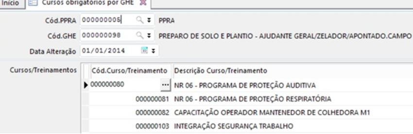 • Disponível no Módulo “Segurança”, através do menu “Segurança -> Gestão de GHE -> Cursos Obrigatórios por GHE” e também no Módulo “Treinamento”, através do menu “Tabelas -> Cargos -> Cursos Obrigatórios por GHE”, esta tela possui a principal finalidade de dedicar quais os “Cursos e ou Treinamentos” obrigatórios para fins de capacitações necessárias em face das exigências legais oriundas das principais “NR´s (Normas Regulamentadoras” do “MTE (Ministério do Trabalho e Emprego)” e ou outras Normas que Cliente faz o controle correlato em face de outras exigências cabíveis.