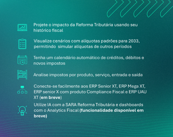 O Simulador da Reforma Tributária da Senior é uma solução inteligente que permite às empresas simular o impacto dos novos impostos previstos na Reforma Tributária (CBS, IBS e posteriormente IS). Com base em dados de movimentações passadas, o simulador projeta cenários futuros, auxiliando no planejamento tributário e na tomada de decisões estratégicas.